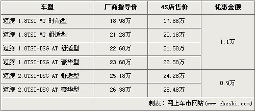 據(jù)北京一汽大眾經(jīng)銷店銷售人員介紹,邁騰全系車型全系優(yōu)惠1.1萬元。經(jīng)1.1萬元的優(yōu)惠后,全系入門級(jí)的1.8TSI MT時(shí)尚型的售價(jià)從18.98萬元下降到了17.88萬元。全系最高配的邁騰2.0TSI豪華版經(jīng)9000元優(yōu)惠后,售價(jià)降到了25.48萬元。銷售人員還介紹,目前邁騰全系現(xiàn)車都比較充足。