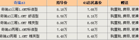 全新的2010款奇瑞A3于近日正式上市,全系均添加了ESP并在內(nèi)外裝飾上有了更多的亮點(diǎn)。筆者從奇瑞汽車經(jīng)銷商了解到,2010款A(yù)3目前現(xiàn)車很少,現(xiàn)在預(yù)訂要等到明年1月初提車,目前價(jià)格上沒有優(yōu)惠。不過店內(nèi)還有部分老款庫存車型,其中三廂車型在享受最高5000元優(yōu)惠的同時(shí)還可贈(zèng)送多重優(yōu)惠,包括送全額購(gòu)置稅,價(jià)值3000元左右的外牌以及國(guó)產(chǎn)全車貼膜、倒車?yán)走_(dá)裝潢等等,禮包實(shí)惠價(jià)值超過了8000元。