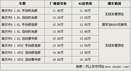 據(jù)北京一汽大眾4S店銷售人員介紹,目前高爾夫6全系只有1.6L手動舒適版有現(xiàn)車,欲提這款車型的消費(fèi)者需在購車時加裝店內(nèi)價值6000元的裝飾后方可提車。店內(nèi)其他車型均無現(xiàn)車,欲購買者需交訂金2000元,約等3個月后才可提車。