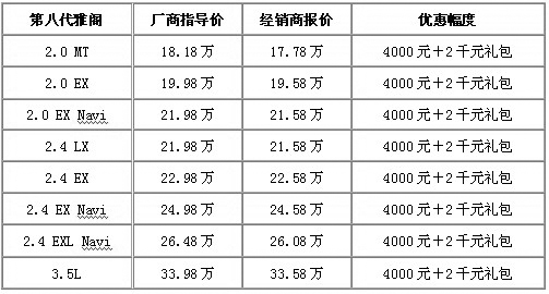 新雅閣,自誕生之日起就打著“史上最強(qiáng)雅閣”的旗號(hào),10月更是一舉奪得昆明中級(jí)車上牌量亞軍,其實(shí)力不容小覷。近日,車天下編輯從廣本梁源店獲悉,自2009年12月14日至12月31日購(gòu)置雅閣車型即可享受4000元?dú)q末現(xiàn)金優(yōu)惠以及2000元店慶購(gòu)車禮包。具體車型及詳細(xì)優(yōu)惠政策,如下表:
