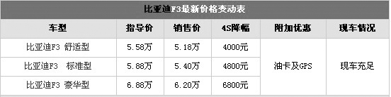 筆者從滬上經(jīng)銷商處了解到,比亞迪F3豪華版最高優(yōu)惠6800元,而舒適型和標(biāo)準(zhǔn)型各優(yōu)惠4000元和4800元。目前現(xiàn)車充足,到店即可提車,感興趣的朋友不妨到店詳談,可以爭(zhēng)取到更多的讓利。