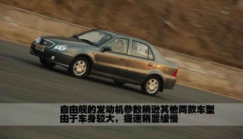 自由艦發(fā)動機的參數(shù)指標明顯不如夏利N5和新羚羊,最大扭矩輸出為5200轉,低速扭矩的表現(xiàn)不盡人意。另外,自由艦車身大于其他兩款車型,靜止提速和運動中提速都略遜于其他兩款車型。