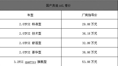 2009年1月5日,一汽-大眾在海南省三亞市正式宣布其開(kāi)始在國(guó)內(nèi)銷(xiāo)售奧迪A4L,這是第8代奧迪A4的國(guó)內(nèi)版本。新的奧迪A4L在今天共有裝備2款發(fā)動(dòng)機(jī)的5款車(chē)型銷(xiāo)售,官方指導(dǎo)價(jià)格從29.88到53.88萬(wàn)元,相信在一段時(shí)期內(nèi),國(guó)內(nèi)消費(fèi)者在全國(guó)各大奧迪4S店購(gòu)買(mǎi)A4L的時(shí)候都會(huì)執(zhí)行這個(gè)售價(jià)。