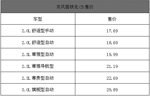 2009年11月23日,在第七屆中國國際汽車博覽會上,備受矚目的09年B級車市壓軸之作,東風(fēng)雪鐵龍品牌戰(zhàn)略旗艦車型C5正式公布價格。東風(fēng)雪鐵龍C5共有2.0L、2.3L和3.0L三種排量,四種級別可供選擇,其價格區(qū)間為17.69萬-29.89萬元。從即日起,全國各指定銷售網(wǎng)點開始接受預(yù)訂,首批展車也將陸續(xù)到店,并于2010年1月初正式交付。