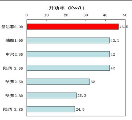 升功率看起來是一項(xiàng)枯燥的數(shù)據(jù),但對(duì)于實(shí)際用車來說意義非凡。這意味著“通過較小的排量獲得較大的動(dòng)力性能。”所以它的實(shí)際動(dòng)力性甚至比那些絕對(duì)功率比它大的車型都要強(qiáng)勁。雖然哈佛和陸風(fēng)、中興等都是2.5、2.8排量的“大家伙”,但很多人駕駛?cè)A泰圣達(dá)菲2.0T的感覺勁道更足,就是源于這個(gè)道理。