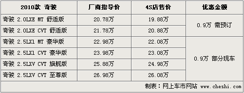 奇駿2010款全車系音響系統(tǒng)升級(jí)為數(shù)碼6碟高保真劇院CD+Audio音響系統(tǒng),并新增了一款奇駿至尊版,擁有車身包圍套裝、5.8英寸彩色觸摸顯示屏、智能語音導(dǎo)航系統(tǒng)、高保真劇院音響系統(tǒng)、側(cè)可視系統(tǒng)、倒車影像監(jiān)視系統(tǒng)、可伸縮行李廂遮物簾等七大亮點(diǎn)配置。在銀色、黑色等顏色的基礎(chǔ)上,奇駿2010款還增加了瑪瑙紅車色,更顯時(shí)尚、動(dòng)感。