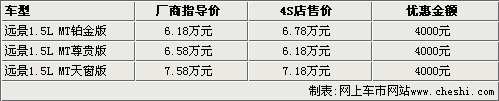 據(jù)吉利汽車4S店銷售人員介紹,現(xiàn)在遠景1.5L車型不是很齊全,天窗版沒有現(xiàn)車需要預(yù)訂。元旦之前,遠景1.5L車型全系可以優(yōu)惠5000元,但目前這款車型只能優(yōu)惠4000元。不過銷售人員表示,如果到店購車,除了有4000元現(xiàn)金優(yōu)惠以外,還可以贈送全車裝飾。
