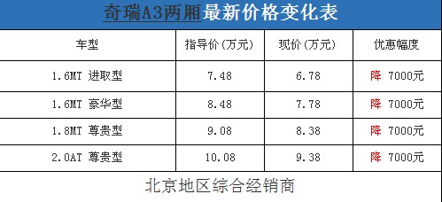 近日,編輯從北京地區(qū)綜合經(jīng)銷商處了解到,奇瑞A3的現(xiàn)車充足,顏色也比較齊全,提供給消費(fèi)者的選擇空間較大;目前購買該車全系都可以優(yōu)惠7000元現(xiàn)金,與之前的降價(jià)幅度相比有了小幅度的提升,性價(jià)比很不錯(cuò)。據(jù)經(jīng)銷商透露,消費(fèi)者要想以這個(gè)價(jià)格購車,需要在店內(nèi)做一條龍服務(wù),其中車輛四項(xiàng)基本險(xiǎn)最低可以打7折(約合2500-3000元左右)。以下是奇瑞A3最新價(jià)格變化表: