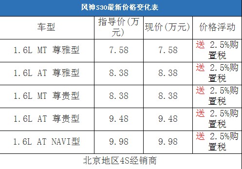 東風風神S30上市后,價格一直都比較穩(wěn)定,和競爭對手相比,風神S30的價格優(yōu)勢并不是非常突出,因此市場表現(xiàn)也只能用一般來形容,其12月份不足5000輛的月銷量也從側(cè)面反映了這個問題。我們近日從北京地區(qū)的一家東風風神汽車4S經(jīng)銷商處了解到,目前該店正在舉行購車送2.5%購置稅的活動,相當于有1500元以上的現(xiàn)金優(yōu)惠。以下是風神S30全系車型最新報價表: