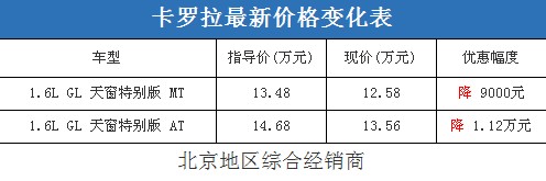 近日,編輯從北京地區(qū)綜合經(jīng)銷商處了解到,卡羅拉有1.6L特別版現(xiàn)車(銀色、黑色、紅色);目前購車的優(yōu)惠幅度與09年末相比有了顯著提升,最高優(yōu)惠1.12萬元,性價(jià)比還不錯(cuò)。據(jù)經(jīng)銷商透露,消費(fèi)者要想以這個(gè)價(jià)格提車,需要在店內(nèi)做一條龍服務(wù),其中車輛保險(xiǎn)的折扣需要消費(fèi)者到店與銷售人員詳談才能夠確定。以下是卡羅拉最新價(jià)格變化表: