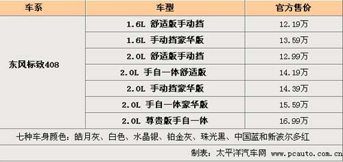 1月25日,東風(fēng)標(biāo)致408在北京全球首發(fā)上市,這是標(biāo)致汽車品牌創(chuàng)立120年以來,首次在海外市場(chǎng)全球首發(fā)其最新一代車型,同時(shí)公布了全系車型的售價(jià)。此次上市的東風(fēng)標(biāo)致408系列共有7款車型,分為舒適版、豪華版、尊貴版三種配置版本,以配備CVTS-II技術(shù)的2.0L發(fā)動(dòng)機(jī)為主打產(chǎn)品,其價(jià)格從12.99萬元至16.99萬元;同時(shí)408系列中也包含1.6L發(fā)動(dòng)機(jī)系列,其手動(dòng)舒適版入門售價(jià)為12.19萬元,主打車型2.0L舒適版手自一體版售價(jià)為14.19萬元。7款車型的售價(jià)如下表: