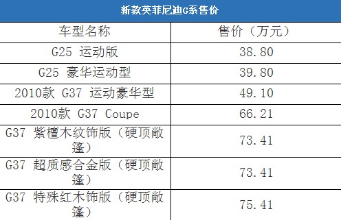 1月11日,英菲尼迪G系全線上市。其中,英菲尼迪 G37硬頂敞篷跑車為人民幣75.41萬元(特殊紅木飾版)和73.41萬元(木飾版);G25 運動型豪華轎車售價為人民幣39.8萬元(豪華運動版)和38.8萬元(運動版)。同期上市的還有2010款英菲尼迪 G37雙門跑車和四門運動型豪華轎車,售價分別為人民幣66.21萬元和49.1萬元。