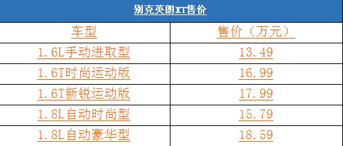 1月23日,上海通用全新五門轎跑英朗正式上市,據(jù)悉此次上市共推五款車型,分別為1.6L手動進取版、1.8L自動時尚版、1.8L自動豪華版、1.6T時尚運動版及1.6T新銳運動版,售價13.49-18.59萬元,具體售價如下表所示: