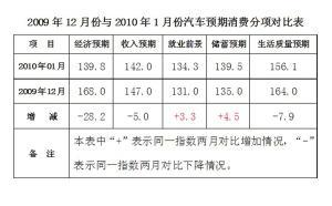 通過與2009年12月份的數(shù)據(jù)對(duì)比發(fā)現(xiàn)(見左圖),就業(yè)前景與儲(chǔ)蓄預(yù)期與上月相比略有上升,但幅度很小。第一個(gè)月居民對(duì)經(jīng)濟(jì)形勢的預(yù)期要比去年12月份略低28.2,說明居民對(duì)經(jīng)濟(jì)前景表明了一種較為謹(jǐn)慎的樂觀,尤其是進(jìn)入一月份以來,宏觀政策再次調(diào)控房價(jià),這對(duì)于很多人的經(jīng)濟(jì)預(yù)期或多或少都有影響。但從總體來看,前后兩個(gè)月的平均變化為6.7,變化不是很大。