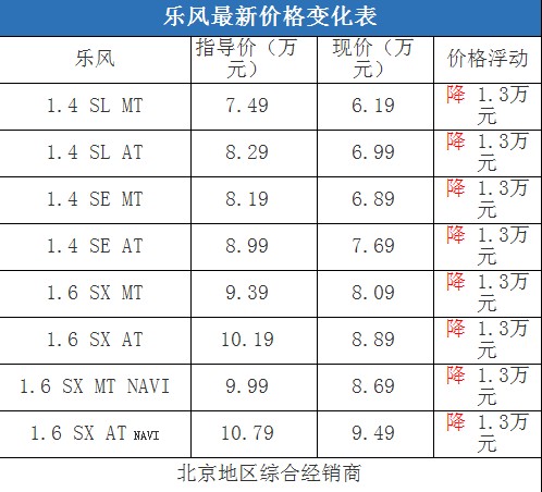 樂風(fēng)SL車型與SE車型的差價為7000元,在配置上SE車型增加了車內(nèi)中控鎖、遙控鑰匙、后視鏡電動調(diào)節(jié)和音響揚聲器;作為一款主打性價比的小車而言,基本款的樂風(fēng)就可以滿足一般家用消費者的需要。而樂風(fēng)1.6L排量車型的定價在小型車中不論是從性能還是從配置上來說競爭力都不明顯。