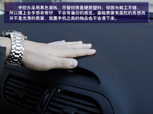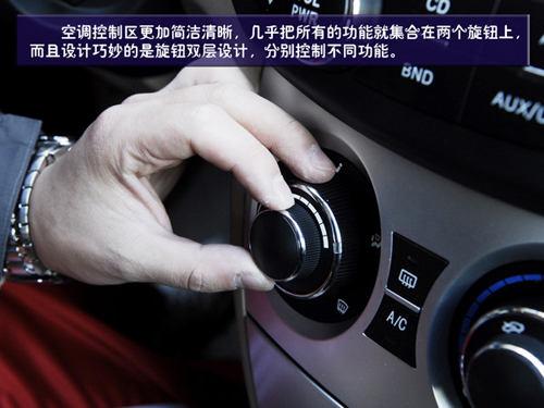 空調(diào)控制區(qū)就更加簡潔了,幾乎把所有的功能就集合在兩個(gè)旋鈕上,而且設(shè)計(jì)巧妙的是旋鈕雙層設(shè)計(jì),分別控制不同功能。但在使用時(shí)我們發(fā)現(xiàn)旋鈕的指示標(biāo)是一個(gè)小的凹槽,在光線不足是可以看到是一個(gè)小燈,但在白天時(shí)這個(gè)凹槽并不十分明顯,可能會(huì)造成讀取的小障礙。