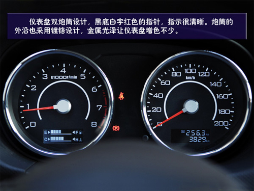 儀表盤雙炮筒設(shè)計(jì)與運(yùn)動(dòng)風(fēng)格相統(tǒng)一,黑底白字紅色的指針,指示很清晰。炮筒的外沿也采用了鍍鉻設(shè)計(jì),金屬光澤讓儀表盤增色不少。轉(zhuǎn)速表的炮筒內(nèi)集成油箱和水溫表,用方格來顯示。時(shí)速表炮筒內(nèi)集成公里計(jì)數(shù),而這里顯示的分別是總里程和短時(shí)里程,不需要切換,讀取更方便。
