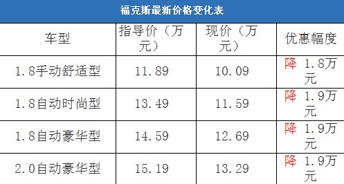 近日,編輯從北京地區(qū)長安福特4S經(jīng)銷商處了解到,福克斯的現(xiàn)車充足,顏色也比較全,但是目前購車沒有任何優(yōu)惠,只能消費者到店與銷售人員詳談才可以爭取少量優(yōu)惠。相比之下,福克斯在綜合經(jīng)銷商處的優(yōu)惠最高達到了1.9萬元,性價比非常不錯。以下是福克斯三廂最新價格變化表: