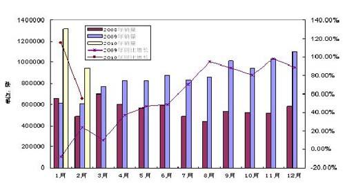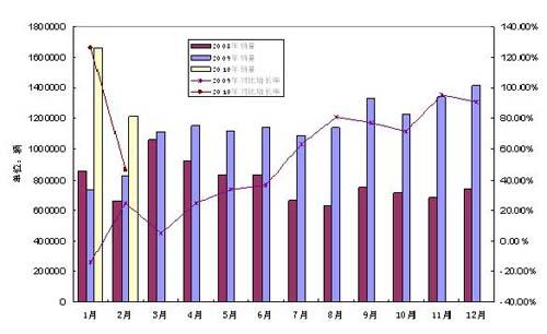 據統(tǒng)計,2月,乘用車產銷分別為91.94萬輛和94.29萬輛,同比分別增長55.46%和55.25%。1-2月,乘用車累計產銷分別為216.33萬輛和225.89萬輛,同比分別增長93.78%和85.46%。其中,自主品牌乘用車共銷售112.48萬輛,占乘用車銷售總量的49.80%,比2009年所占比例提升了5.5個百分點。