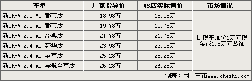 東風本田旗下的CR-V車型自上市以來,一直以其較高的性價比占領著國內(nèi)家用SUV市場的半壁江山,提現(xiàn)車的加價銷售從CR-V上市之日起持續(xù)到了現(xiàn)在,CR-V的暢銷為同級別車型樹立了典范。3月5日東風本田正式推出全新的CR-V,在售價不變的情況下對全系車型進行了配置升級,并推出了導航版車型。那么新車上市后的市場行情是什么樣子呢?根據(jù)網(wǎng)上車市價格監(jiān)測系統(tǒng)顯示,全新上市的CR-V依然存在加價售車的現(xiàn)象。具體車型售價見下表:
