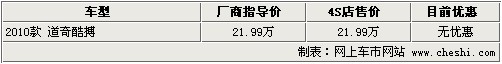 據(jù)4S店銷售人員介紹:目前2010款道奇酷搏北京地區(qū)無現(xiàn)車,但部分4S店內(nèi)接受預(yù)訂,定金為5000元。據(jù)經(jīng)銷商介紹,2010款酷搏計(jì)劃將在第二季度引入中國,但最早可能在3月份到店銷售。2010款酷搏仍將搭載2.0升自然吸氣發(fā)動(dòng)機(jī),在配置上將與08款車型相差不多,相比09款車型配置更豐富;此款車型售價(jià)為21.99萬元,在價(jià)格方面與老款車型持平。