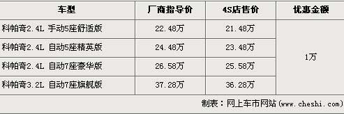科帕奇車型分為2.4L與3.2L兩種排量,2.4L手動五座舒適版和2.4L七座手自一體豪華版兩款車型先期上市,2.4L 5座精英版和3.2L排量的車型隨后也上市銷售,全車系售價區(qū)間為22.48萬元-37.28萬元。近期根據(jù)網(wǎng)上車市價格監(jiān)測顯示,科帕奇2.4L車型全系優(yōu)惠1萬元,具體詳情請看下表: