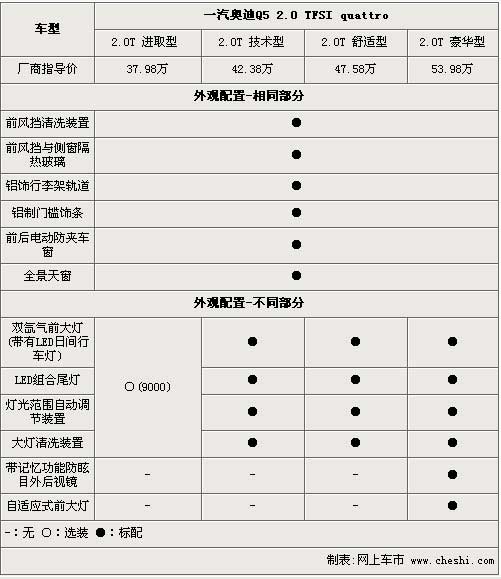 國(guó)產(chǎn)奧迪Q5全系均安裝了全景天窗,在車(chē)型均安裝了鋁飾行李架軌道,并且前風(fēng)擋以及側(cè)窗都安裝了帶有隔熱功能的吸能玻璃,愛(ài)美的女車(chē)主可以不必在為了怕曬黑自己,而涂上厚厚一層的防曬霜了。除了入門(mén)級(jí)的進(jìn)取型之外,其他三款車(chē)型均安裝了帶有LED日間行車(chē)燈的雙氙氣前大燈,并且?guī)в星按鬅羟逑垂δ埽琇ED尾燈也安裝上身。雖然進(jìn)取型沒(méi)有標(biāo)配這些配置,不過(guò)只要您愿意,花費(fèi)9000元這些配置同樣可以選裝上身。頂配的豪華版車(chē)型上,自適應(yīng)式前大燈可以比其他三款車(chē)型給駕駛員提供更人性化更廣闊的視野范圍。