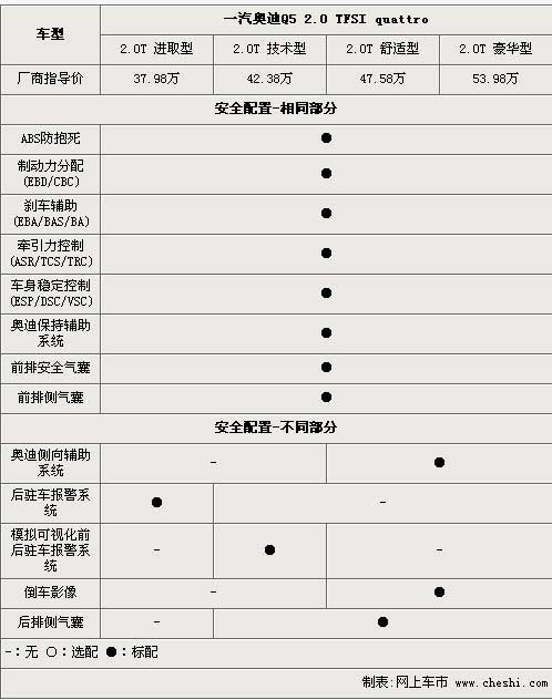 在主動(dòng)安全與輔助安全性方面,ABS防抱死系統(tǒng)、制動(dòng)力分配、剎車輔助、動(dòng)態(tài)車身穩(wěn)定系統(tǒng)等主動(dòng)安全設(shè)備都被配備在了全系車型身上,奧迪保持輔助系統(tǒng)則可以在您偏離行駛軌道時(shí),通過(guò)方向盤的震動(dòng)向駕駛員提醒車輛脫離行駛車道。前排安全氣囊以及前排側(cè)氣囊兩項(xiàng)輔助安全配置也全系安裝上身,而在進(jìn)取型上則取消了后排側(cè)安全氣囊。4款車型在駐車提示方面配置差異較大,進(jìn)取型采用了傳統(tǒng)的雷達(dá)探頭報(bào)警系統(tǒng),技術(shù)型采用的是模擬可視化前后駐車報(bào)警系統(tǒng),而舒適型以及豪華型則安裝了更加直觀的倒車影像。