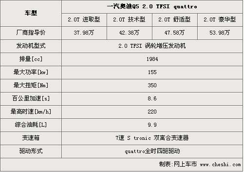 國(guó)產(chǎn)奧迪Q5搭載了大眾EA888系列的2.0TFSI渦輪直噴發(fā)動(dòng)機(jī),經(jīng)過(guò)重新調(diào)校后,此款發(fā)動(dòng)機(jī)的最大功率為155kw,而在1500-4200轉(zhuǎn)可以爆發(fā)出350Nm的最大扭矩。奧迪Q5采用了7速 S tronic 雙離合變速器,此款變速器既充滿手動(dòng)變速箱的駕駛樂(lè)趣,同時(shí)又融合自動(dòng)變速器便捷操作的變速器,換擋的頓挫感更小,平順性也更好,再配上奧迪的quattro全時(shí)四驅(qū)驅(qū)動(dòng)方式,奧迪Q5被打造成了真正的一款注重性能的SUV車型。