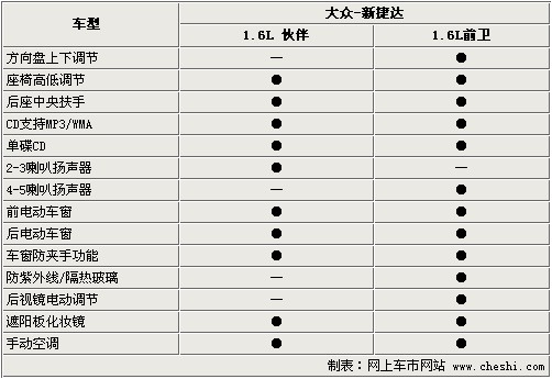 新推出的兩款車型保證了基本的舒適性及娛樂性,座椅高低調(diào)節(jié)及后排中央扶手提供了基本的配置。支持MP3/WMA的單碟CD音響方便了使用,兩款車只是在喇叭數(shù)量上有所區(qū)別。全車標(biāo)配電動門窗,對于捷達較低的價格而言也算難能可貴。但方向盤上下調(diào)節(jié)、防紫外線/隔熱玻璃、后視鏡電動調(diào)節(jié)在伙伴上并沒有出現(xiàn)?梢钥闯,廠家對于這款經(jīng)濟型轎車的成本控制還是很嚴(yán)格的。