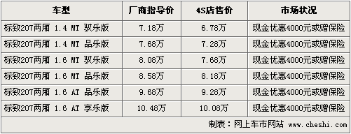 標(biāo)致207系列在推出限量版車(chē)型后,一直備受消費(fèi)者關(guān)注。兩廂207在繼承了三廂車(chē)型優(yōu)點(diǎn)的同時(shí),又添加了許多運(yùn)動(dòng)因素,更適合年輕時(shí)尚的消費(fèi)者。根據(jù)網(wǎng)上車(chē)市價(jià)格監(jiān)測(cè)系統(tǒng)顯示,目前207兩廂可以?xún)?yōu)惠現(xiàn)金4000元,或選擇贈(zèng)送4項(xiàng)保險(xiǎn)及大禮包。具體車(chē)型行情如下: