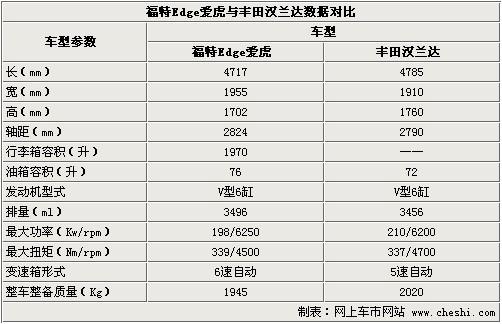由于2011款Edge銳界并沒(méi)有公布官方數(shù)據(jù)及價(jià)格,我們只好利用它的上代車(chē)型Edge愛(ài)虎做個(gè)比較,看看它的競(jìng)爭(zhēng)對(duì)手到底是誰(shuí)?從上表顯示的數(shù)據(jù)表明,Edge愛(ài)虎與國(guó)內(nèi)市場(chǎng)上銷(xiāo)售的豐田漢蘭達(dá)有非常相似之處。無(wú)論車(chē)身尺寸還是發(fā)動(dòng)機(jī)配備,都有著明顯的競(jìng)爭(zhēng)關(guān)系。由于漢蘭達(dá)的設(shè)計(jì)年份比愛(ài)虎更晚,所以在車(chē)身長(zhǎng)度及車(chē)高方面占據(jù)一定優(yōu)勢(shì)屬于正常現(xiàn)象。兩者且相同配備3.5L V6引擎,只是在變速箱選擇上有所不同。如果單方面從變速箱擋位數(shù)上看,愛(ài)虎要比漢蘭達(dá)更先進(jìn)。