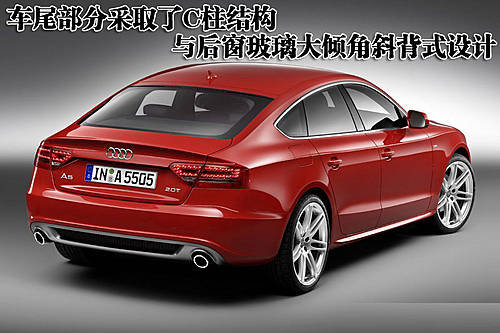 奧迪A5 Sportback四門轎跑車除加長軸距以外,依然延續(xù)奧迪A5雙門轎跑版的大部分車身結(jié)構(gòu)。不過在車尾部分采取了對C柱結(jié)構(gòu)與后窗玻璃改動(dòng)最小的大傾角斜背式設(shè)計(jì),增加了實(shí)用性。