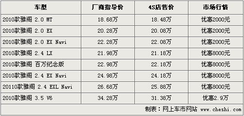 新雅閣一直是日系中級車型的典型代表,新雅閣憑借其大氣的外觀、舒適的空間和豪華的配置在中級轎車市場中占據(jù)了一席之地。去年,廣汽本田又對第8代雅閣進(jìn)行了小改款,對原來車型的配置有一定程度提升,部分車型增加了智能鑰匙和后遮陽板等,提高了雅閣整體車型的性價比。近日根據(jù)網(wǎng)上車市價格監(jiān)測系統(tǒng)顯示,目前雅閣全系最高優(yōu)惠近3萬元,2.4L現(xiàn)車較齊全。具體價格以及優(yōu)惠幅度如下: