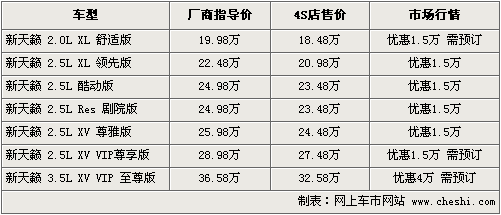 據(jù)東風日產(chǎn)4S店銷售人員介紹,目前新天籟3.5車 型的優(yōu)惠最高可以達到4萬元,其余車型均可以享受到1.5萬元的現(xiàn)金優(yōu)惠,入門級車型優(yōu)惠后售價為18.48萬。目前銷售以2.5車型為主,2.0車型、 2.5高配車型和3.5車型都需要預定,訂貨周期在1-2周時間左右,F(xiàn)車顏色方面以黑色、銀色為主。由于各店的訂單不同,各店銷售的車型和顏色有所不 同。