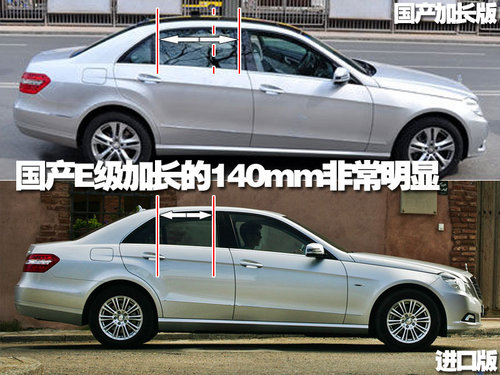從上面進(jìn)口原裝奔馳E級(jí)轎車與國產(chǎn)奔馳新E級(jí)轎車加長(zhǎng)版的對(duì)比可以發(fā)現(xiàn),國產(chǎn)新車型的加長(zhǎng)部分全部出現(xiàn)在B柱之后,而這部分也是決定后排乘客腿部空間最為重要的部分。我們可以從后窗的面積非常直觀的看出加長(zhǎng)前后的明顯區(qū)別。