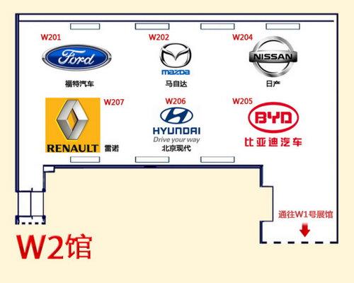 在本屆北京車展,W2館有日產(chǎn)、現(xiàn)代、馬自達(dá)、比亞迪汽車、福特汽車、雷諾等共6個品牌參展,主要亮點車型:日產(chǎn)LEAF、日產(chǎn)Juke、北京現(xiàn)代RC、北京現(xiàn)代i50、馬自達(dá)馬自達(dá)8、比亞迪S6/L3、福特銳界、福特新?怂挂约袄字Z新梅甘娜CC等。