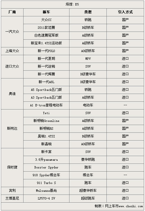 在本屆北京車(chē)展的E5館,一共有9家廠(chǎng)商再次館中布展,除了布加迪沒(méi)有新車(chē)之外,其他8家廠(chǎng)商均帶來(lái)了新車(chē)型與消費(fèi)者們見(jiàn)面。一汽大眾帶來(lái)了備受矚目的國(guó)產(chǎn)版大眾CC以及新寶來(lái)1.4TSI等4款新車(chē)型,上海大眾則帶來(lái)了新一代的A0級(jí)小車(chē)POLO參展,進(jìn)口大眾為大家?guī)?lái)了新一代途銳、新一代輝騰等3款新車(chē)型,斯柯達(dá)也為大家?guī)?lái)了首款SUV產(chǎn)品Yeti等新車(chē)型,新A8L也在奧迪的新車(chē)隊(duì)列中;超跑品牌出現(xiàn)在了E5展館,保時(shí)捷為大家?guī)?lái)了918 Spyter概念車(chē)以及價(jià)格門(mén)檻更低的3.6升panamera等新車(chē)型,賓利以及蘭博基尼也為大家?guī)?lái)了更加豪華以及速度更快的新車(chē)。