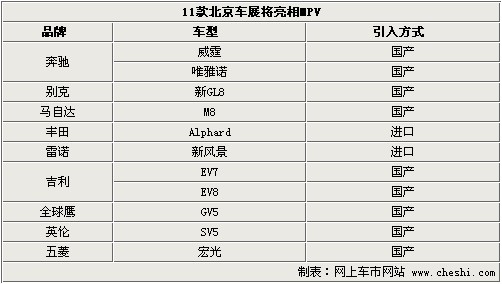 這次在2010北京車展上展出的MPV共有十余款,我們選擇了奔馳、別克、馬自達(dá)、雷諾、豐田、吉利、全球鷹、英倫、五菱共9個(gè)品牌11款車型。在國(guó)內(nèi)知名度相對(duì)較高的車型有別克GL8,馬自達(dá)8以及五菱宏光。下面將為您奉上這十余款車型的詳細(xì)介紹,希望您能夠喜歡。