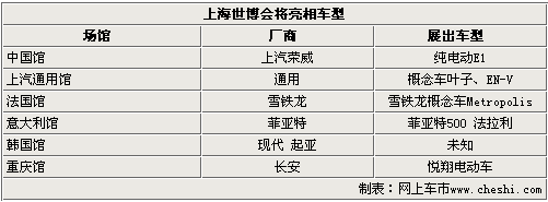 在本次世博會(huì)上,中國(guó)館中將展出上汽榮威推出的純電動(dòng)車E1,這款車在本屆北京車展中已經(jīng)正式亮相,預(yù)計(jì)將在2012年正式實(shí)現(xiàn)量產(chǎn)。在通用館展出的EN-V日前已在上海以全球首發(fā)的身份亮相,由于造型不同他們分別被命名為“驕”、“妙”和“笑”。這款雙人座EN-V電動(dòng)聯(lián)網(wǎng)車創(chuàng)新地融合了電氣化和車聯(lián)網(wǎng)兩大技術(shù),從而實(shí)現(xiàn)未來城市交通零油耗、零排放、零堵塞和零事故。其余將亮相的車型還包括雪鐵龍全新概念車Metropolis、菲亞特500、法拉利和長(zhǎng)安悅翔電動(dòng)車等。