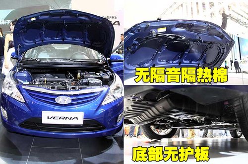 北京現(xiàn)代Verna的發(fā)動(dòng)機(jī)艙布局比較規(guī)整,走線合理。在發(fā)動(dòng)機(jī)蓋上輔以隔音材質(zhì),同時(shí)在靠近發(fā)動(dòng)機(jī)后方的部分也設(shè)有隔音、隔熱層。車輛底部沒(méi)有裝備的底盤護(hù)板,使Verna在復(fù)雜路面行駛時(shí)其底盤少了一重保護(hù),而且這款車型的發(fā)動(dòng)機(jī)艙蓋開(kāi)啟沒(méi)用采用液壓桿的設(shè)計(jì)。