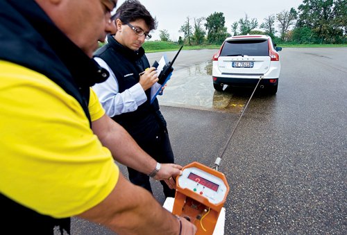 這一測試的目的在于測量車輛的牽引力,我們要使用一個十分精確的測量范圍達數(shù)千千克的測力計。正如在照片中看到的,車輛的四個輪子都在濕滑的大理石上,我們在上面說過,其附著力與在冰面上差不多。測力計的一邊通過一條鋼索與車體相連,另一邊固定在一個位置上。測試員啟動汽車把鋼索拉直,然后繼續(xù)加油直到車輪開始打滑,這時很多因素都要考慮,包括發(fā)動機功率、車的重量、輪胎的合成材料等,這些都是重要的參考數(shù)據(jù)。四驅車比兩驅車明顯占據(jù)上風,特別是XC60,其四驅版的牽引力比兩驅版高出了74%。Kuga兩個版本的差距為41%,略微小些。需要說明的是,正像前面說過的,沃爾沃兩款車的功率相差30馬力,其他方面沒有大的差別。在主要測試結束后,我們換了個地點重復剛才的測試,不是四個輪子都在大理石上,而是兩個在大理石上,兩個在瀝青上,仍然為濕滑路面。這也是為了測試防滑系統(tǒng)的功效,這時需要差速器的機械鎖止裝置發(fā)揮作用,Kuga和XC60上都沒有這一裝置。兩個輪子在瀝青上增加了附著力,可以看到測力計上顯示的數(shù)字與上次相比四輛車都增大了。福特兩驅車牽引力為602千克,四驅為820千克;沃爾沃兩款車的差距還是那么大,兩驅為710千克,四驅為1050千克。