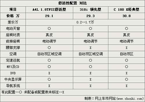 為了讓駕駛變得更輕松讓旅程變得更愜意,高端轎車一般都會具備較為全面的舒適娛樂設(shè)施。這三款車型基本上都是車系的入門產(chǎn)品,因此在配置上豪華型有所欠佳,實用性上也全部沒有配備GPS導(dǎo)航系統(tǒng)和DVD播放功能。不過3款車型均把一觸式防夾車窗、4門一觸式車窗、CD機作為了標準配備,進一步豐富了整車的功能性和娛樂性。其中奧迪A4L還提供了中央顯示屏以及雙區(qū)域的自動恒溫空調(diào),應(yīng)該說是更為細致入微的。