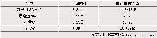 6月21日來自長安馬自達(dá)的馬自達(dá)3三廂車型將會亮相一個小改款車型,在外形上這款“新”馬自達(dá)3與老款車型區(qū)別并不大,沒有改變成為進(jìn)口馬自達(dá)3車型的全新外觀,但是整車配置方面有所提升。6.22日的時候國產(chǎn)豐田越野車PRADO俗稱霸道將會推出全新一代產(chǎn)品,新款PRADO外形和內(nèi)飾上都會相比老款車型有明顯的提升,而唯一令人期待的就是它的價(jià)格了。6月23日別克的三廂緊湊型轎車英朗GT將會正式上市發(fā)布價(jià)格,而據(jù)別克內(nèi)部人士透露英朗GT的定位可能并不會太低,因此期待英朗GT定出較低價(jià)位的朋友到時候可是要重點(diǎn)的關(guān)注一下了。最后一款是保時捷在中國持續(xù)大賣的豪華SUV卡宴,據(jù)說新的卡宴在北京車展亮相之后就已經(jīng)接到了非常多的訂單,僅北京就接近200臺的預(yù)定數(shù)量,那么如果您也希望購買保時捷新卡宴,真的要提早的去經(jīng)銷商那里提交一份訂單了。