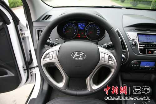 我們拿到的這輛ix35是2.0GLS尊貴版,采用全黑色內(nèi)飾,除此之外還有上黑下淺的另一種內(nèi)飾風格。全黑色內(nèi)飾顯然更招年輕人待見。ix35的內(nèi)飾采用了對稱設計,中控面板造型簡練,中間的六邊形設計和四周的線條再次與車身風格呼應。內(nèi)飾黑底色上點綴的銀色恰到好處,只是幾乎整個內(nèi)飾采用的都是印花硬性材質(zhì),車內(nèi)氣味比較明顯,多少與這輛車20萬出頭的價位有些不符。另外,豎條形的空調(diào)出風口似乎很容易讓人想起伊蘭特。