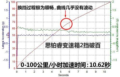 既然說到這里,就讓我們先來看看思鉑睿的加速成績。如果你用S擋自動模式(關(guān)掉車身穩(wěn)定控制),起步的時候根本聽不到輪胎有一絲接近極限的跡象,看著發(fā)動機轉(zhuǎn)速慢慢攀升的樣子讓人覺得時間十分漫長,最終的成績都將會在11秒開外,這顯然不能代表思鉑睿的真實水平。后來測試中我們在S擋下改用手動模式,盡管思鉑睿的5擋變速箱可以2擋破百,也就是說在測試過程中只需要換一次擋,但區(qū)別還是很大。在S擋模式下,發(fā)動機轉(zhuǎn)速會在不到6500轉(zhuǎn)/分鐘的時候自動換擋,而手動模式可以把轉(zhuǎn)速拉到7000轉(zhuǎn),這樣一來在換到2擋時就可以獲得更高的轉(zhuǎn)速,加速成績可以提高將近一秒鐘左右。最終我們實測的思鉑睿0-100加速成績?yōu)椋?0.62秒。