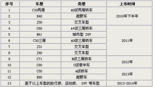 根據規(guī)劃,在2010-2014年的五年內,將會陸續(xù)推出共計20款全新車型,不過目前已經曝光的是12款新車,其中在2010年內有3款新車下線,而2011年將推出5款新車,2012年將推出基于薩博平臺的C71、C80兩款豪華車,2013年比較引人注目的是酷似攬勝的B90將推出。