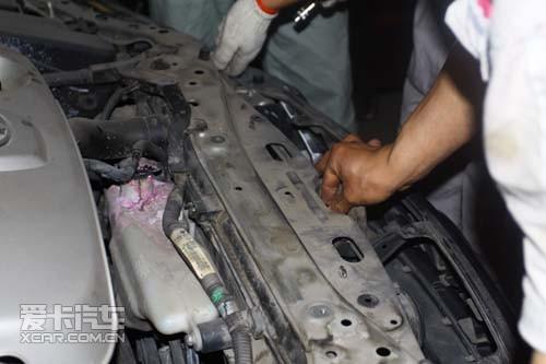 工人師傅們開始動手拆掉外部擋板,來徹底查看一下水箱冷凝器,是不是因為異物和灰塵的堆積導致散熱能力下降,并清理水箱冷凝器外部進氣網(wǎng)。