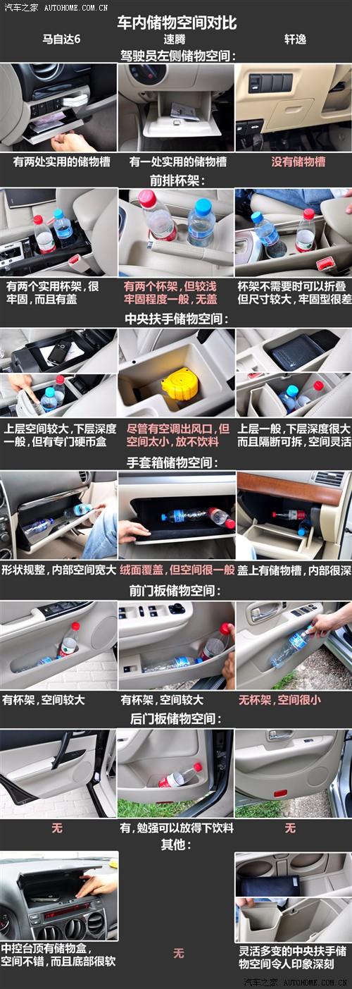 車內(nèi)儲(chǔ)物空間對于車輛實(shí)用性的影響也很大,我們對于三款車用相同的道具、按照相同的標(biāo)準(zhǔn)進(jìn)行衡量: