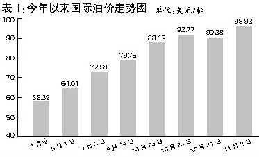 國內油價上漲最直接的因素就是國際油價的大幅攀升。上周國際市場原油價格連創(chuàng)歷史新高,達到了94美元/桶。而在此前,紐約WTI原油期貨價格2007年年初價格為58.32美元/桶,3月份以后國際市場原油價格開始上漲,特別是近兩個月加速上升,9月14日和10月29日分別突破了每桶80美元和90美元。11月2日紐約原油期貨價格大幅上揚,比前一個交易日上漲2.44美元,終盤再創(chuàng)新高,收于每桶95.93美元。這個價格比起今年年初上漲了近40美元,漲幅超過80%。此間,國際油價雖然出現過小幅回落,但高位震蕩的格局一直難以改觀,甚至有愈演愈烈之勢。